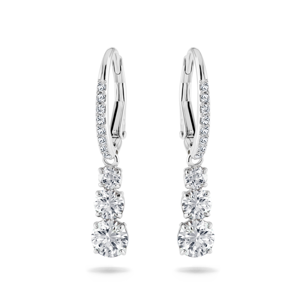 By its very nature eternal love must have a past, a present, and a future, and this pair of stunning pierced earrings has been conceived with that romantic concept in mind. A trio of clear crystals are embellished with pavé and rhodium plating in this scintillating design. Timelessly elegant, they will be a treasured keepsake. A matching necklace and ring are available.