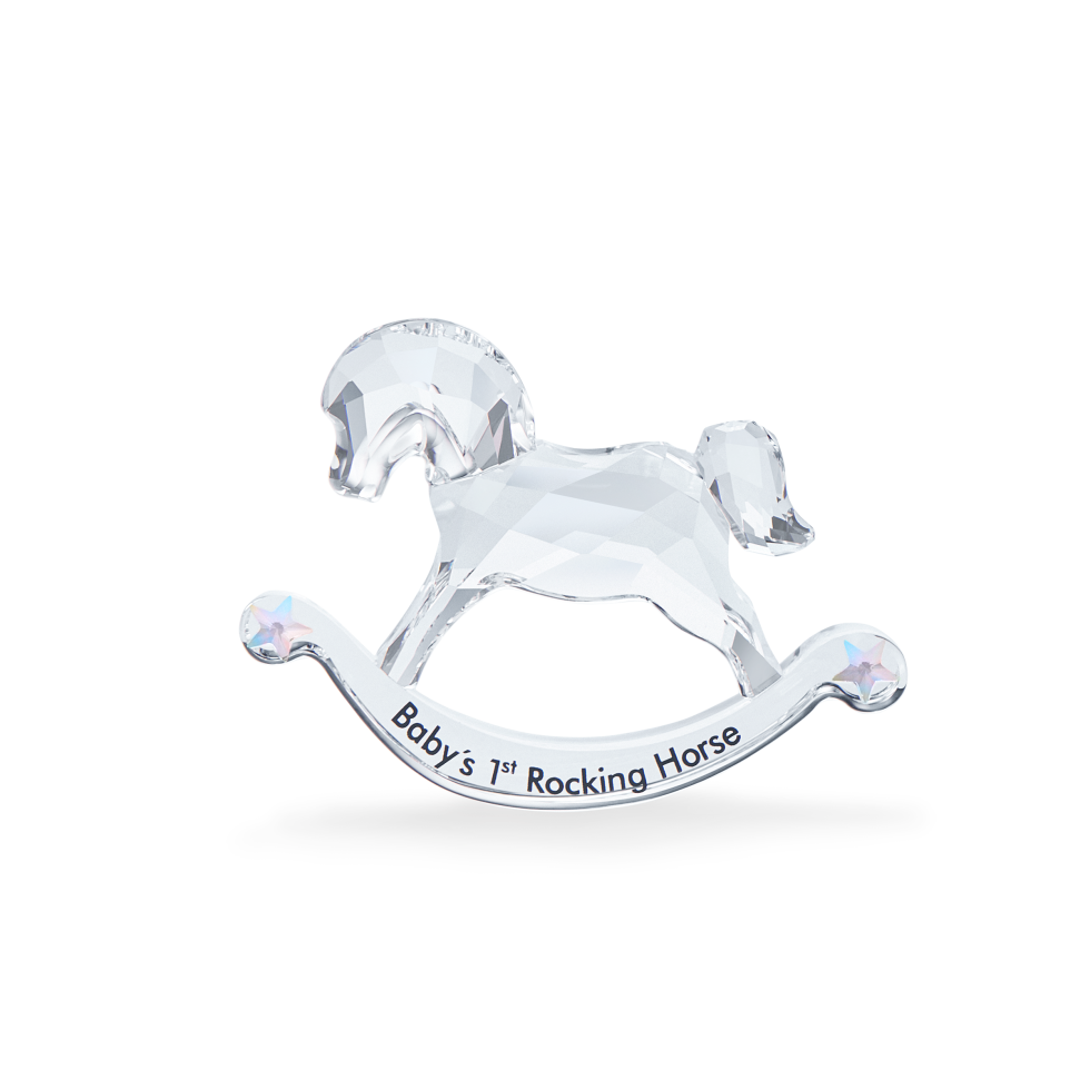 The Baby’s 1st Rocking Horse by Swarovski is a true delight for expecting mothers. 195 facets and a unique shimmering effect make the crystal piece sparkle whenever it refracts incoming light. The name is printed in a subtle gray color tone for a delicate finishing touch. A charming gift for baby showers or births. Decoration object. Not a toy. Not suitable for children under 15.