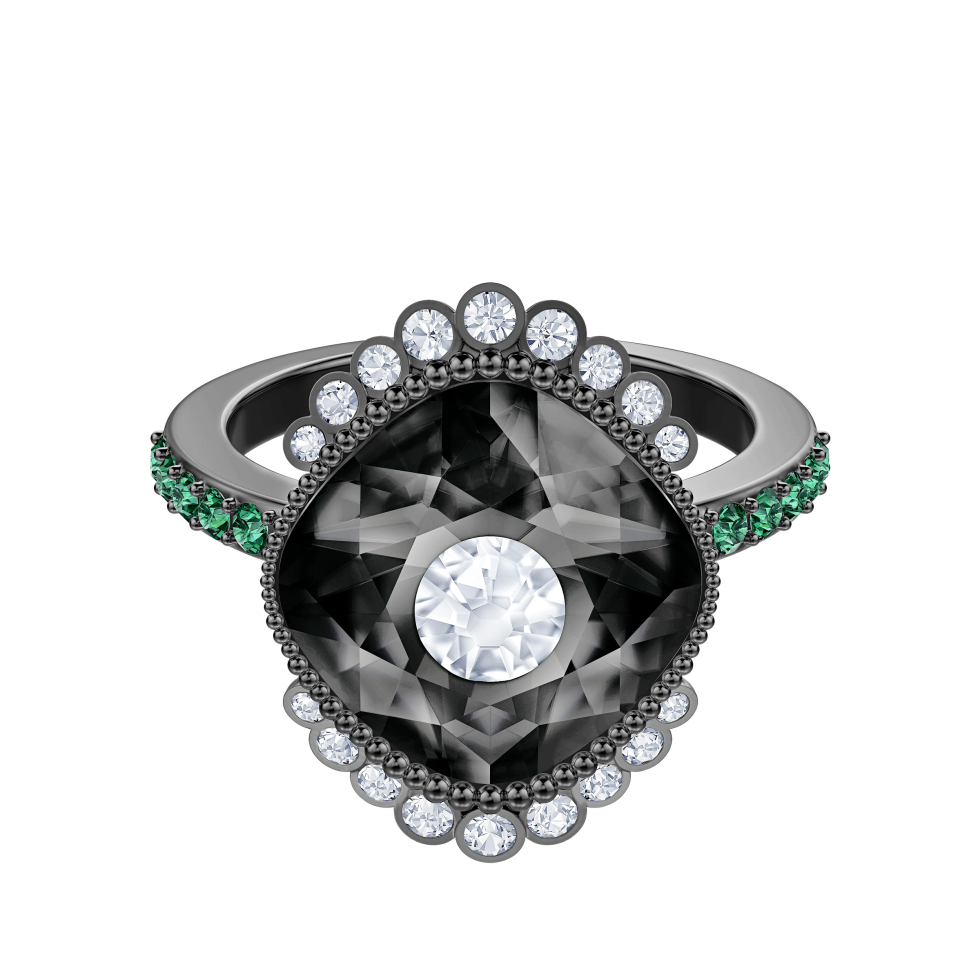 Our Black Baroque collection is inspired by the opulent and ornate design style of the Baroque period. Shining darkly in ruthenium plating, this small ring showcases a black crystal, topped with a clear crystal using our refined stone-on-stone technique. Emerald-colored pavé around the ring shank adds a subtle but dramatic flash of color.