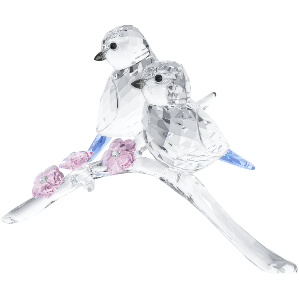 As beautiful as in nature, this pair of blue tits sparkles in clear crystal with Light Sapphire crystal tails, Jet crystal eyes, and Black Diamond crystal beaks. They perch on a clear crystal base decorated with three Rosaline crystal flowers. Decoration object. Not a toy. Not suitable for children under 15.
