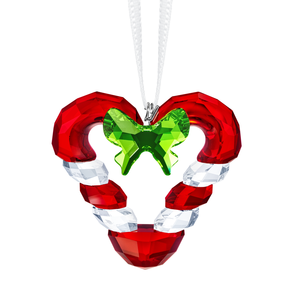 Candy canes have been a joyful symbol of Christmas for years and this charming ornament features a pair of cane motifs, which together form a festive heart shape. Expertly crafted with 502 facets in clear, red, and green crystal, it dangles on a white satin ribbon. A lovely gift to decorate a Christmas tree, table, or window, or it could be displayed on our Christmas Ornament Home Display (large or small). Matching items available. Decoration object. Not a toy. Not suitable for children under 15.