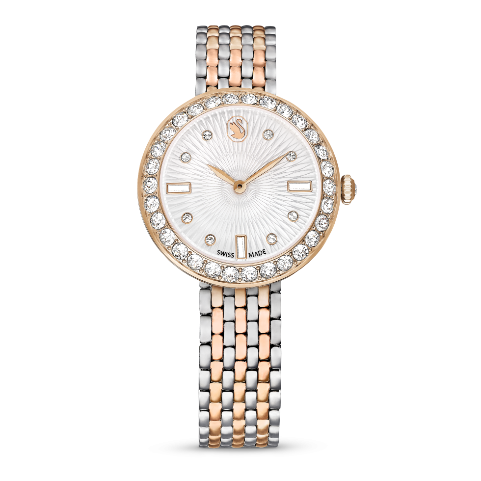 This elegant Certa watch radiates contemporary style in every detail. The round 30mm case is made with a beautiful rose gold-tone finish and features a bezel set with a pavé of 30 crystals. Beneath the mineral glass, a mesmerizing guilloché dial is revealed, with the Swarovski swan logo at 12 o’clock, along with indexes created from round and baguette crystals. There is also a single crystal set in the watch’s crown. For style around the wrist, the watch is presented on a seven-link bracelet in two tones. This Swiss made watch is water resistant to 50m and is designed to keep you on time for everyday occasions with exquisite sophistication.