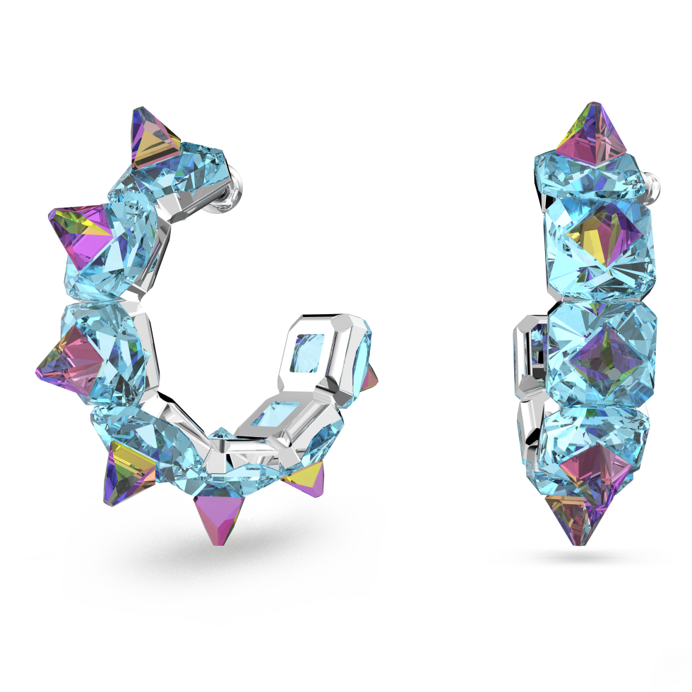 Boldly designed like a deconstructed prism, these rhodium plated hoop earrings dare to stand out from the crowd. Expertly crafted from blue pyramid and cushion cut crystals, this pair exemplifies beauty with an edge. Wear it to bring a touch of vibrant color and sparkle to simple T-shirts, sweatshirts and hoodies. These earrings are part of the Matrix family, designed by Creative Director Giovanna Engelbert for Collection I.