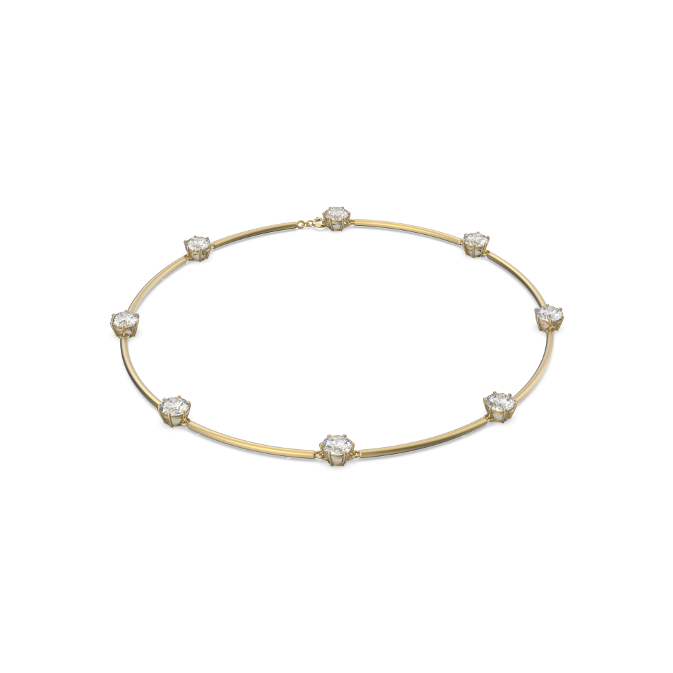 Inspired by the classic solitaire shape, this delicate choker necklace is crafted from a fine, gold-tone plated band studded with round, brilliant cut stones. Each section is linked at intervals, calling to mind constellations and the magic of stargazing. Wear it with denim and a simple white T-shirt to bring the cosmos to the everyday. This necklace is part of the Constella family, designed by Creative Director Giovanna Engelbert for Collection I.