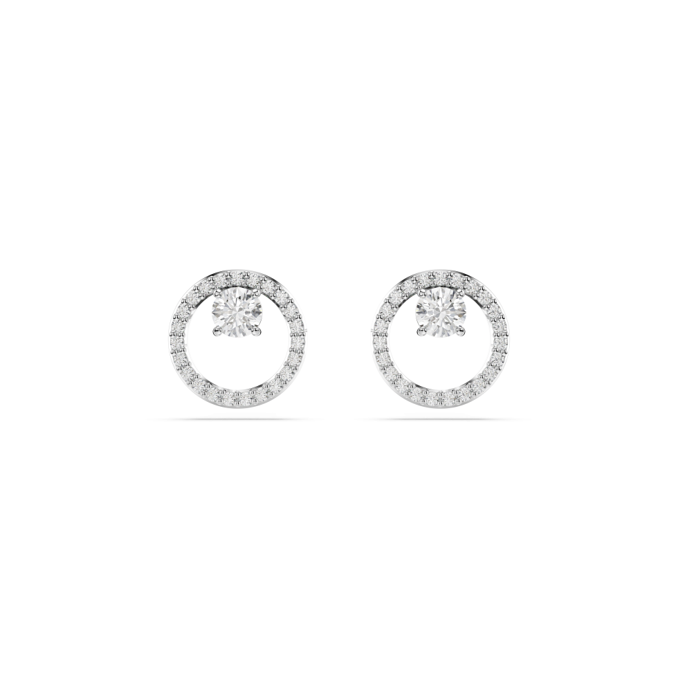 These refined circle studs exude timeless elegance. Each pierced piece is rhodium plated and features a central pavé ring of clear Swarovski Zirconia as well as a single prong-set Swarovski Zirconia placed in the middle. Amp up the drama by pairing with a matching Constella pendant.