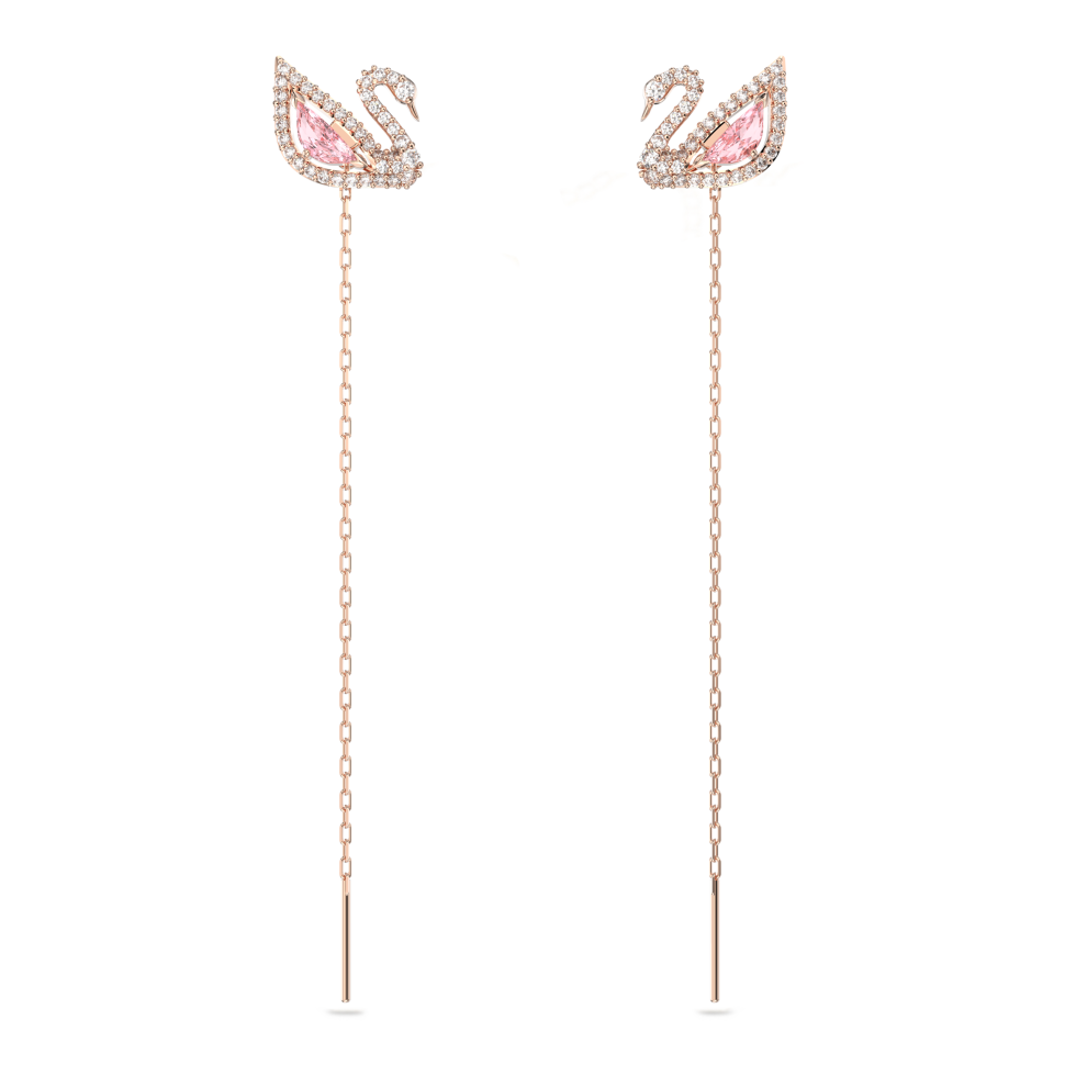 Enjoy multiple looks with this dazzling pair of versatile long-length pierced earrings. The iconic swan motif shines with a full-cut crystal body in cool millennial pink and crisp clear pavé lines. Wear as simple studs, or attach one, or both, of the delicate rose gold-plated chains for more statement style. A dainty design that will undoubtedly add cool and romantic style to your everyday collection. Matching items are available.