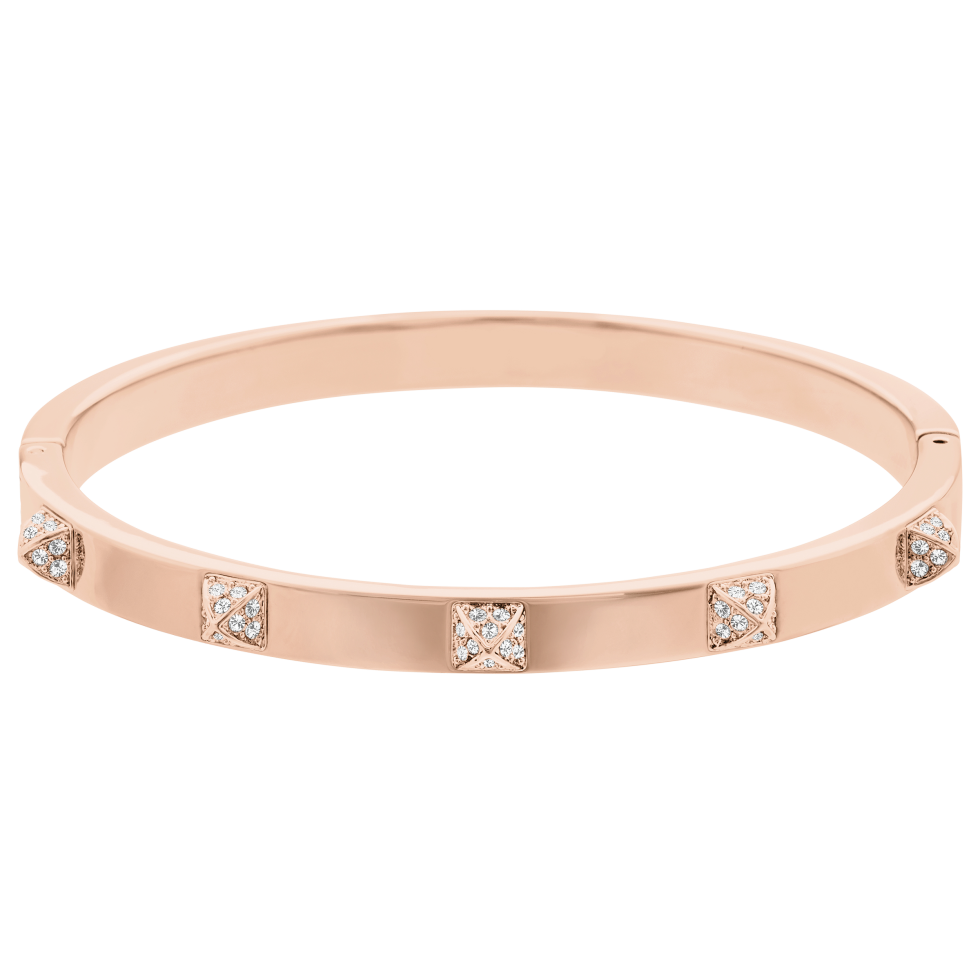 Ideal for fashion lovers! This rose gold PVD bangle honors the thin bangle and spike trends. Embellished with clear crystal pavé, its sleek and modern silhouette combines well with other bangles or bracelets to create an on-trend stacked look.