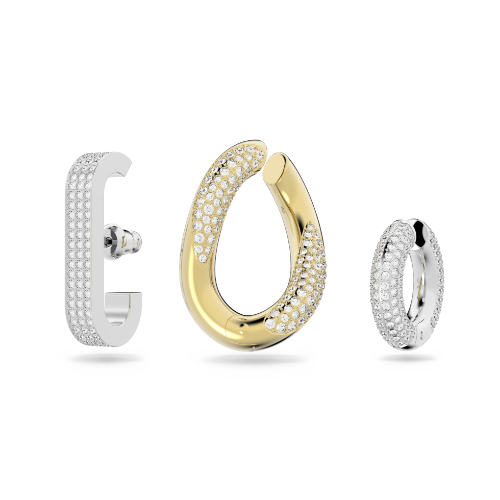 Intricately detailed yet boldly constructed, this ear cuff trio celebrates Swarovski’s sophisticated pavé technique. Delicate, white crystals embedded in rhodium and gold-plated settings make a modern statement. The largest hoop in the set is pierced and cradles the entire earlobe, allowing its industrial-inspired design to shine through. Wear them all together or mix and match with other styles from the Dextera family. This piece is formed from a set of three single earrings; they are sold as one unit and do not come in pairs. These ear cuffs are designed to be worn on the left ear. The largest hoop requires your ear to be pierced. This ear cuff set is part of the Dextera family, designed by Creative Director Giovanna Engelbert for Collection II.