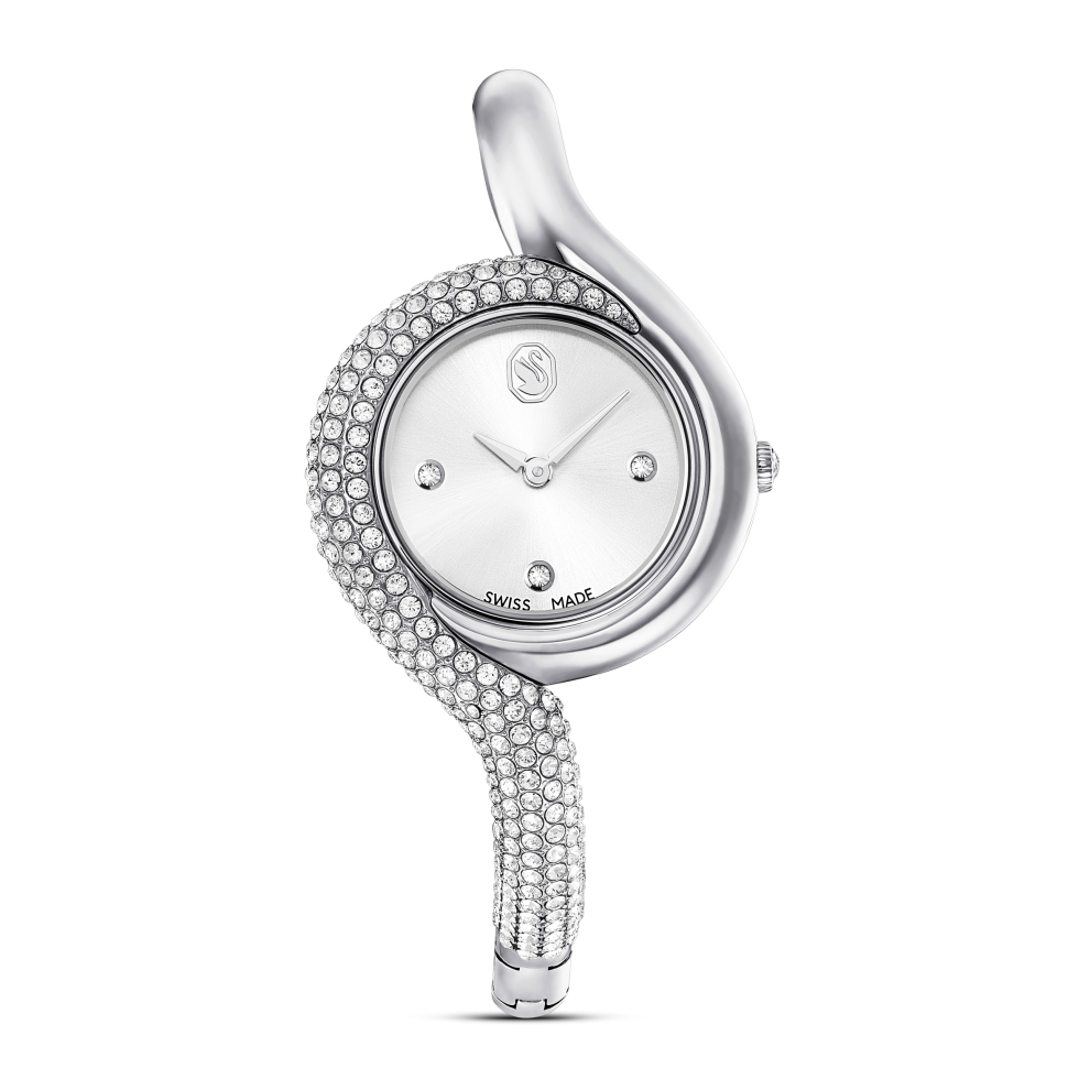 This captivating Dextera watch takes its cues from the classical timepieces of a vintage era. The 29mm stainless steel design is creatively embellished with a pavé of clear crystals over half the bezel, as well as half the bracelet. The minimalist dial features a sunray effect and is accented only with three crystal hour markers and a swan logo at 12 o’clock. A total of 203 crystals are used in the creation of this timepiece, including the single crystal that is placed within the crown. This Swiss made watch is water resistant to 50 meters and is a pure expression of Swarovski sophistication.