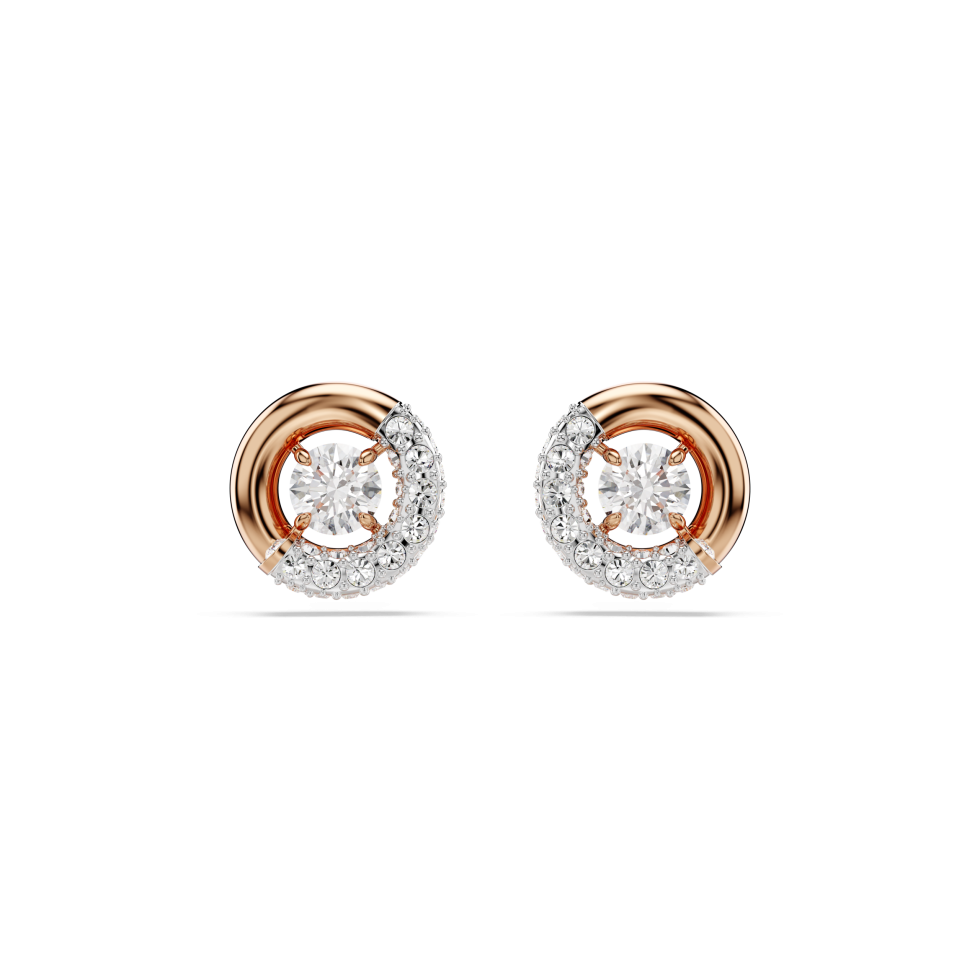 Crafted to catch the light, these Dextera earrings are a dazzling example of Swarovski savoir-faire. Each rose gold-tone plated stud features a central hoop half encrusted with a pavé of clear crystals and a dancing Swarovski Zirconia placed in the middle. Pair with a matching pendant to radiate joy.