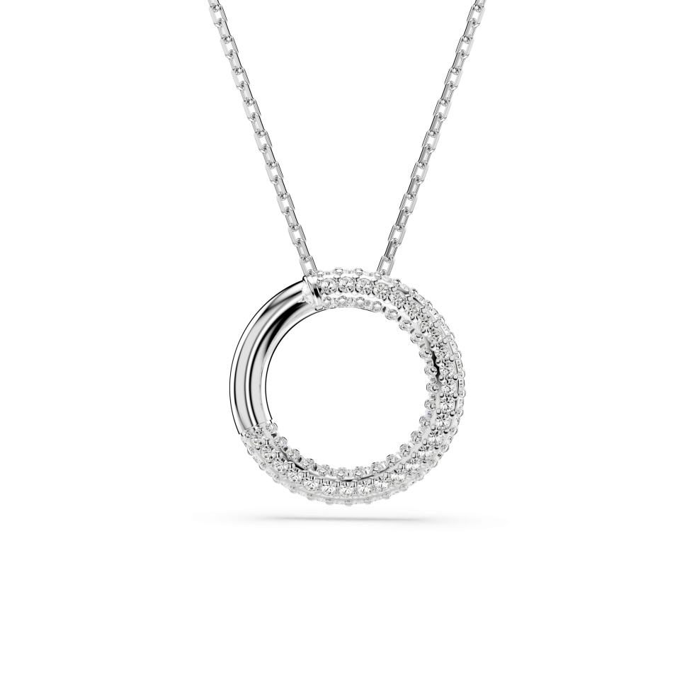 Radiating a halo of light, this mesmerizing Dextera pendant features a central hoop half encrusted with a pavé of clear crystals. The rhodium plated design is suspended from an elegant chain and completed with a lobster closure. The perfect piece to infuse your everyday style with subtle shimmer.