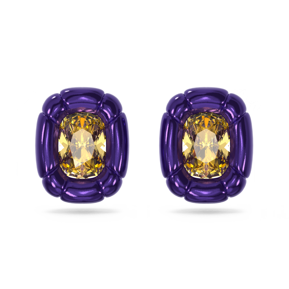 These statement clip earrings will add a playful touch to any look. Featuring light topaz cushion cut crystals encased within a metallic purple Pop-Art inspired setting, this pair is the jewelry equivalent of wearable candy. Style with your hair tucked to really show off their full-spectrum sweetness. These earrings are part of the Dulcis family, designed by Creative Director Giovanna Engelbert for Collection II.