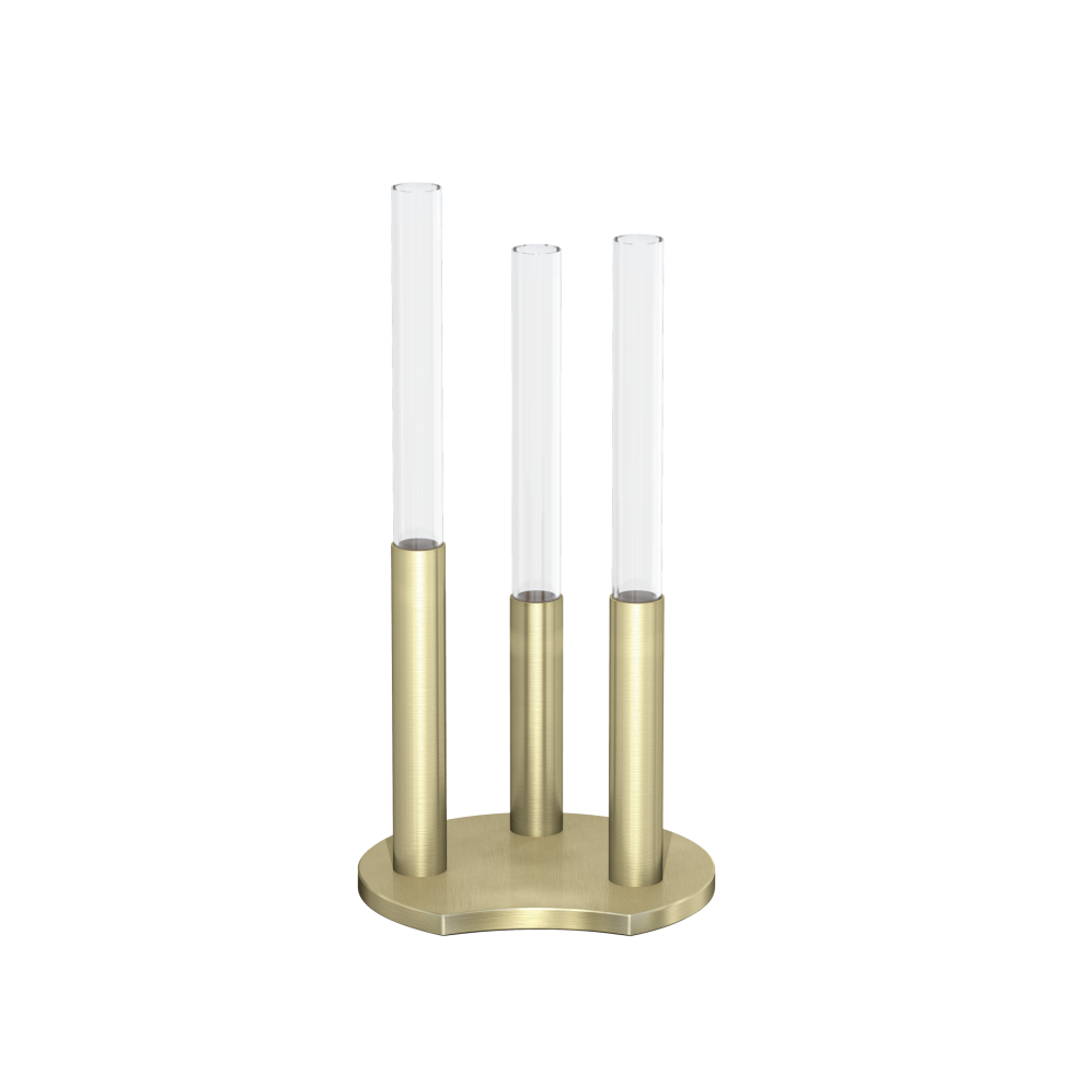 Inspired by the décor trend to display stand-alone blooms, this decorative vase features a trio of vessels to showcase three flowers. Crafted in glass and brushed gold tone plated metal, its warm tones and sleek silhouette will add refined style to a home. A lovely gift, especially when combined with sparkling crystal flowers or floral magnets from the Garden Tales collection. Decoration object. Not a toy. Not suitable for children under 15. Not suitable for use with water.