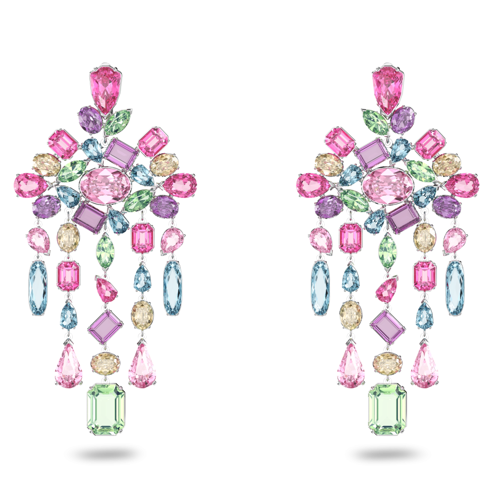 Gema clip earrings, Mixed cuts, Chandelier, Extra long, Multicolored, Rhodium plated