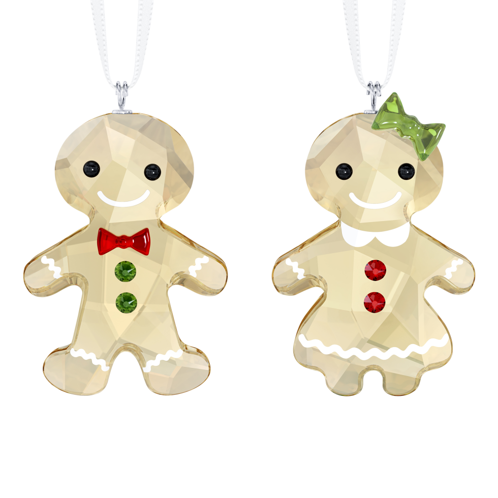 Bring even more joy to the holiday season with this adorable Gingerbread Couple. Sparkling in a combination of festive colors with white printed details, the two characters hang on white satin ribbons. Ideal for brightening up your festive tree, table, or a window. Decoration object. Not a toy. Not suitable for children under 15.