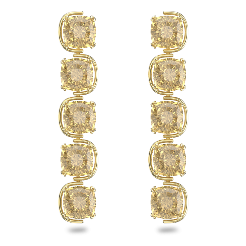 A feat of innovation, these headturning earrings capture the mysterious elegance of the Harmonia family. Designed to give the illusion of floating stones, this bold pair features oversized, cushion-cut crystals in a gold-tone plated prong setting. Style yours with contrasting colors for an ultramodern statement.