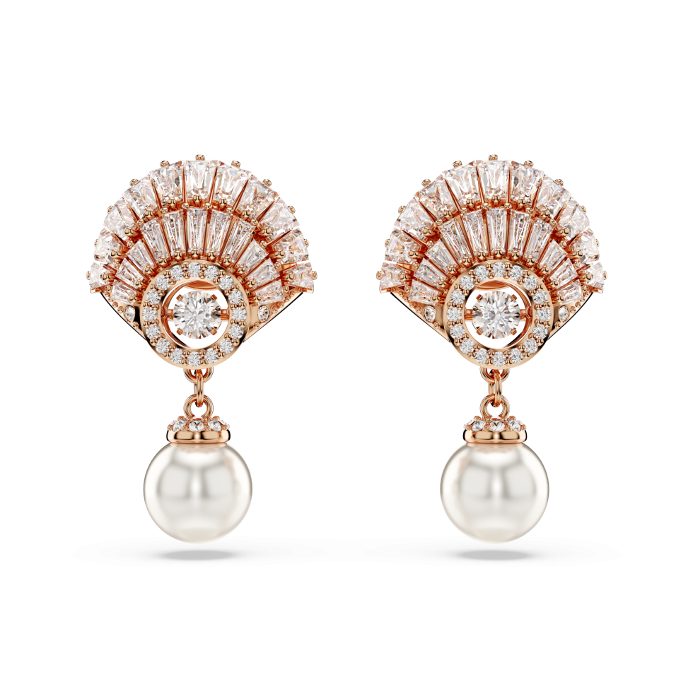 These stunning Idyllia earrings were made for elegant and tranquil styling. Each shell design is rose gold-tone plated and embellished with an array of clear Swarovski Zirconia and a clear round dancing crystal that catches the light. The jewelry is further adorned with a single white Crystal Pearl that delicately hangs beneath. A glamorous choice during the day or for evening occasions.