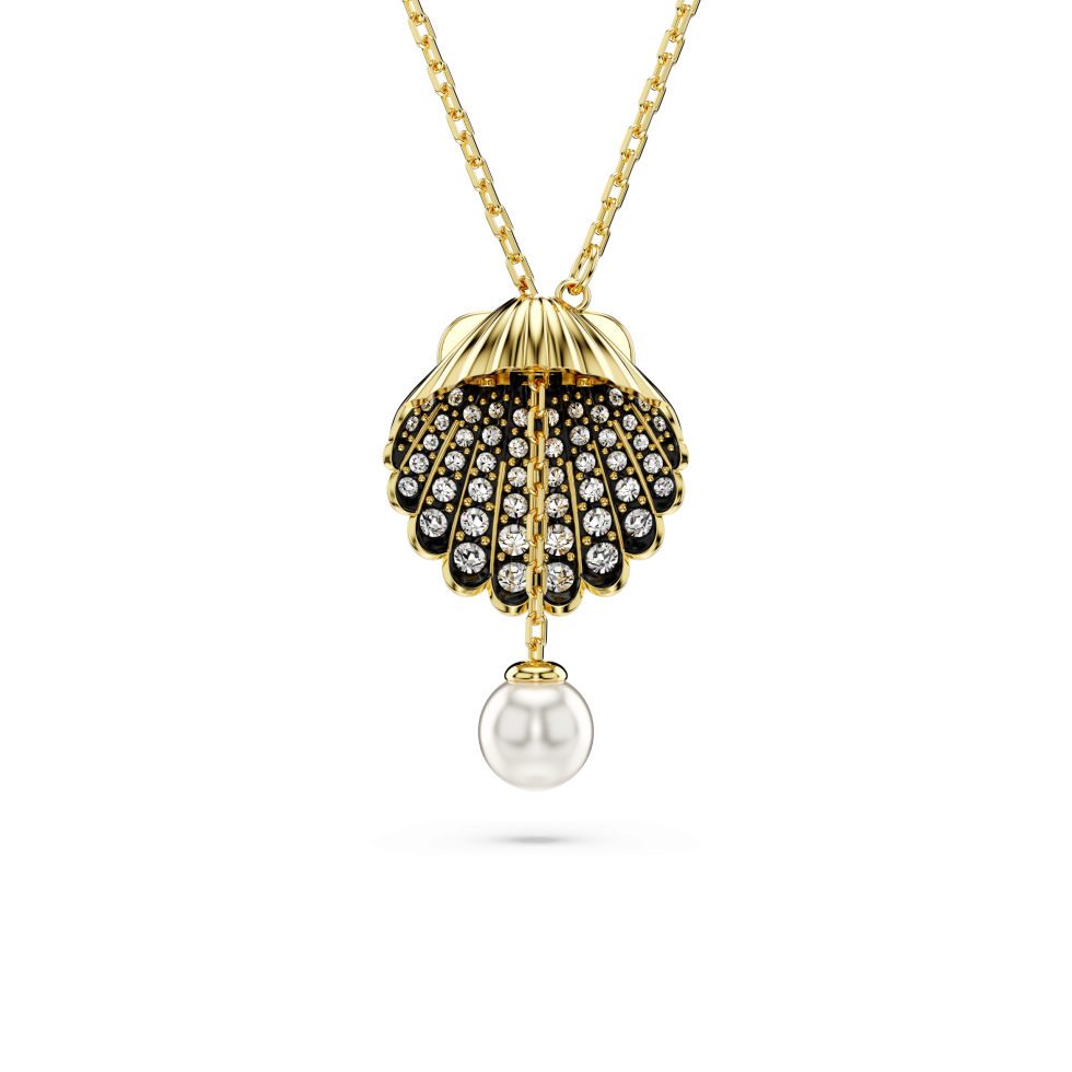 Capturing the serenity and beauty of the ocean, this Idyllia pendant will bring a touch of marine inspiration to your style. The gold-tone plated piece is worn on a delicate necklace and features a shell motif at the center. This has been artistically adorned with clear round crystals placed within a black setting, while a single Crystal Pearl sits inside. For extra versatility, the pearl can be pulled out of the shell, adjusting the style into a Y-shape design. A simple and captivating way to feel at one with the sea.