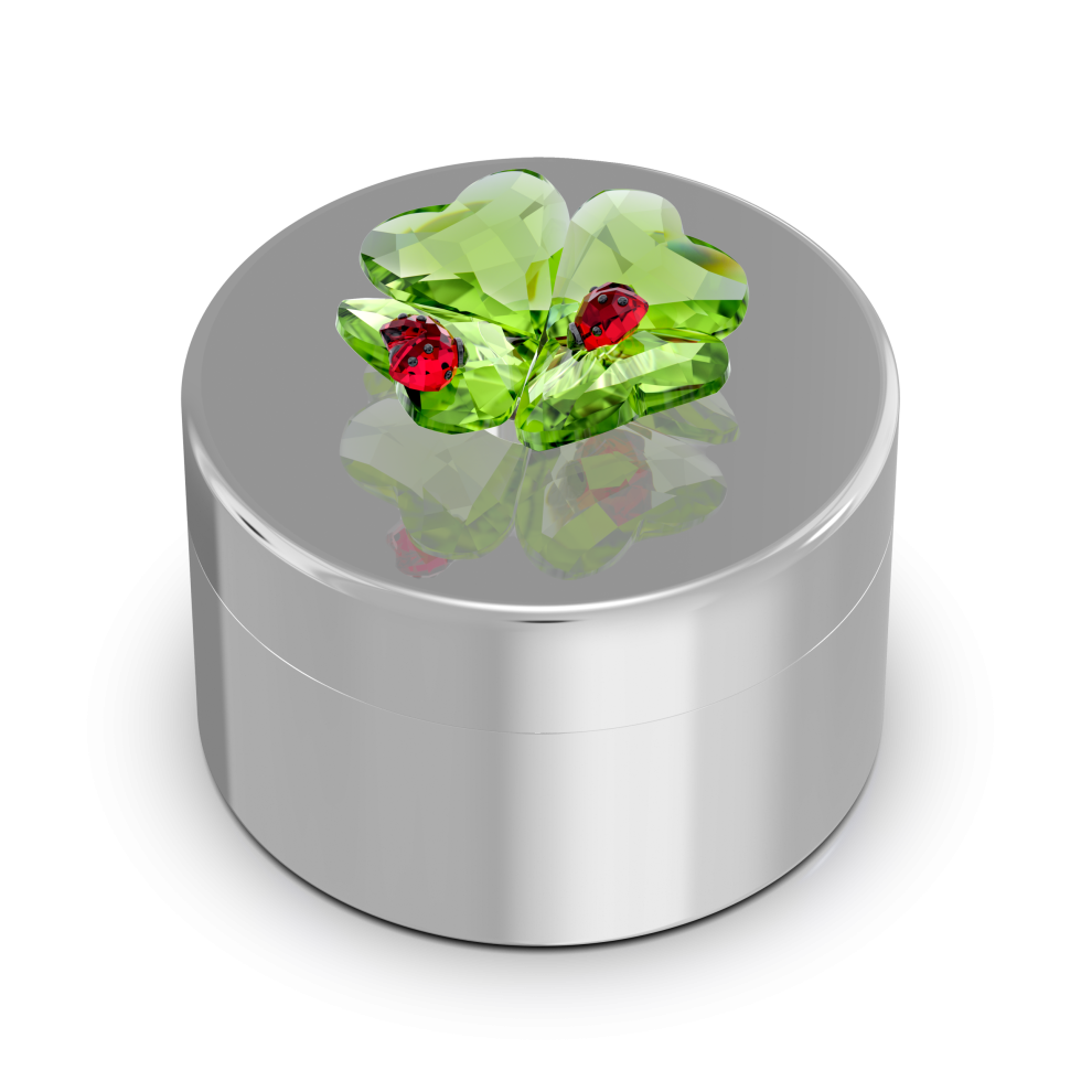 Ideal for storing your treasures, this glossy steel box is playfully adorned with a clover and ladybug display. The nature-inspired motif is crafted with 206 facets, and combines green and red tones that beautifully catch the eye. Inside, the box includes a velvet pouch, to always keep the contents safe and protected. Decoration object. Not a toy. Not suitable for children under 15.