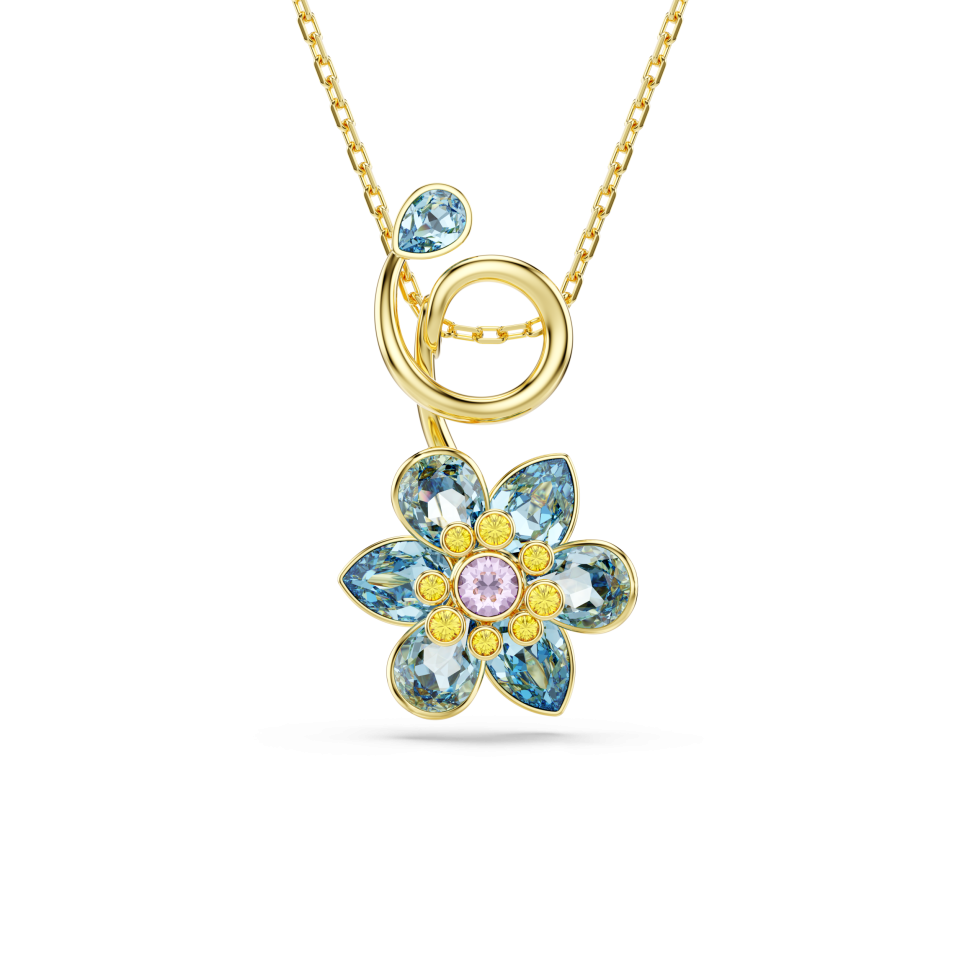 Brighten your style with this crystallized tribute to nature. Suspended from a delicate chain, the central motif is shaped like a flower, with radiant blue petals and a gold-tone plated stem. The mix of shapes and shades gives this Idyllia pendant an infusion of joy, which will boost your mood throughout the day.