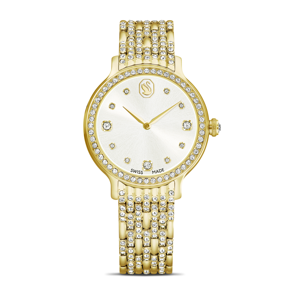 Adorned with 232 individual crystals, this glistening Imber watch is Swarovski’s finest expression of timeless elegance. The 31mm stainless steel design is gold-tone finished and features a pavé bezel set with 52 clear crystals, while one additional crystal is also placed within the crown. On the sunray dial, 11 crystals in small and large sizes are used to mark the hours, along with a swan logo at 12 o’clock. Around the wrist, the watch’s most distinctive feature is the adjustable seven-link bracelet, which is stunningly set with 168 round-cut crystals. This Swiss Made watch is water resistant to 50 meters and matches seamlessly with Swarovski’s selection of Imber jewelry.