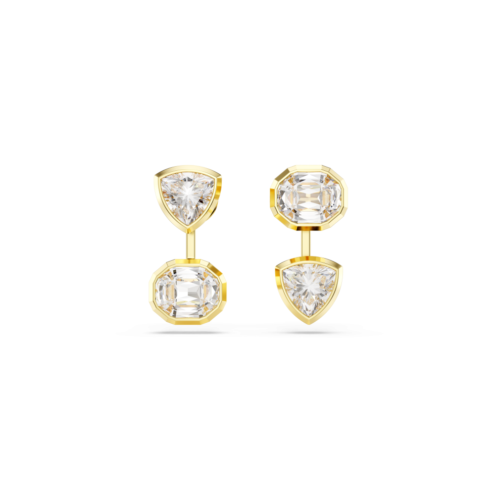 Combining geometry with light, these intriguing statement earrings are gold-tone plated, and feature a pair of trillion- and octagon-cut Swarovski Zirconia on each jacket. The clear stones are placed in a modern bezel setting, and for a dose of asymmetrical style, their position is reversed on either side. Wear these earrings with a matching necklace and let your everyday style shine.