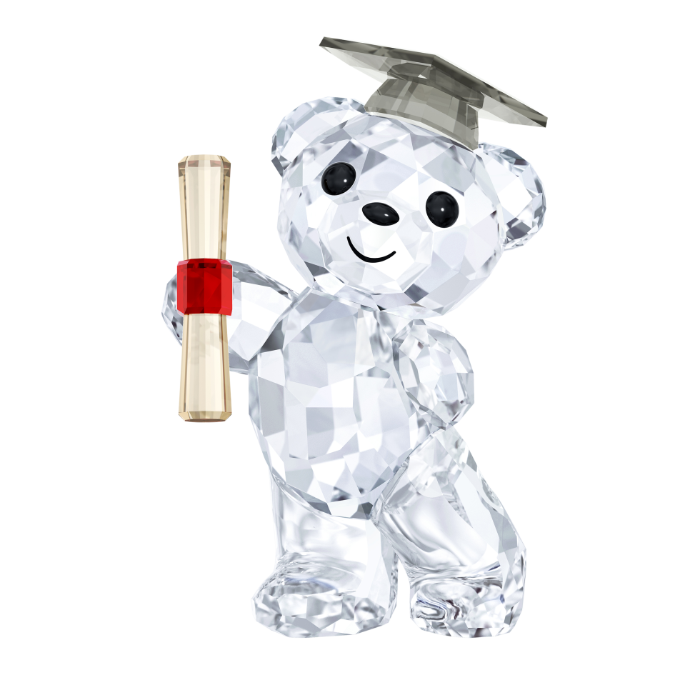 Celebrate graduation day in special Swarovski style with this adorable Kris Bear. The much-loved character wears a graduation cap and brandishes a certificate. Crafted in clear, black, gold, and red crystal, it would be a thoughtful gift to mark a memorable occasion. Decoration object. Not a toy. Not suitable for children under 15.