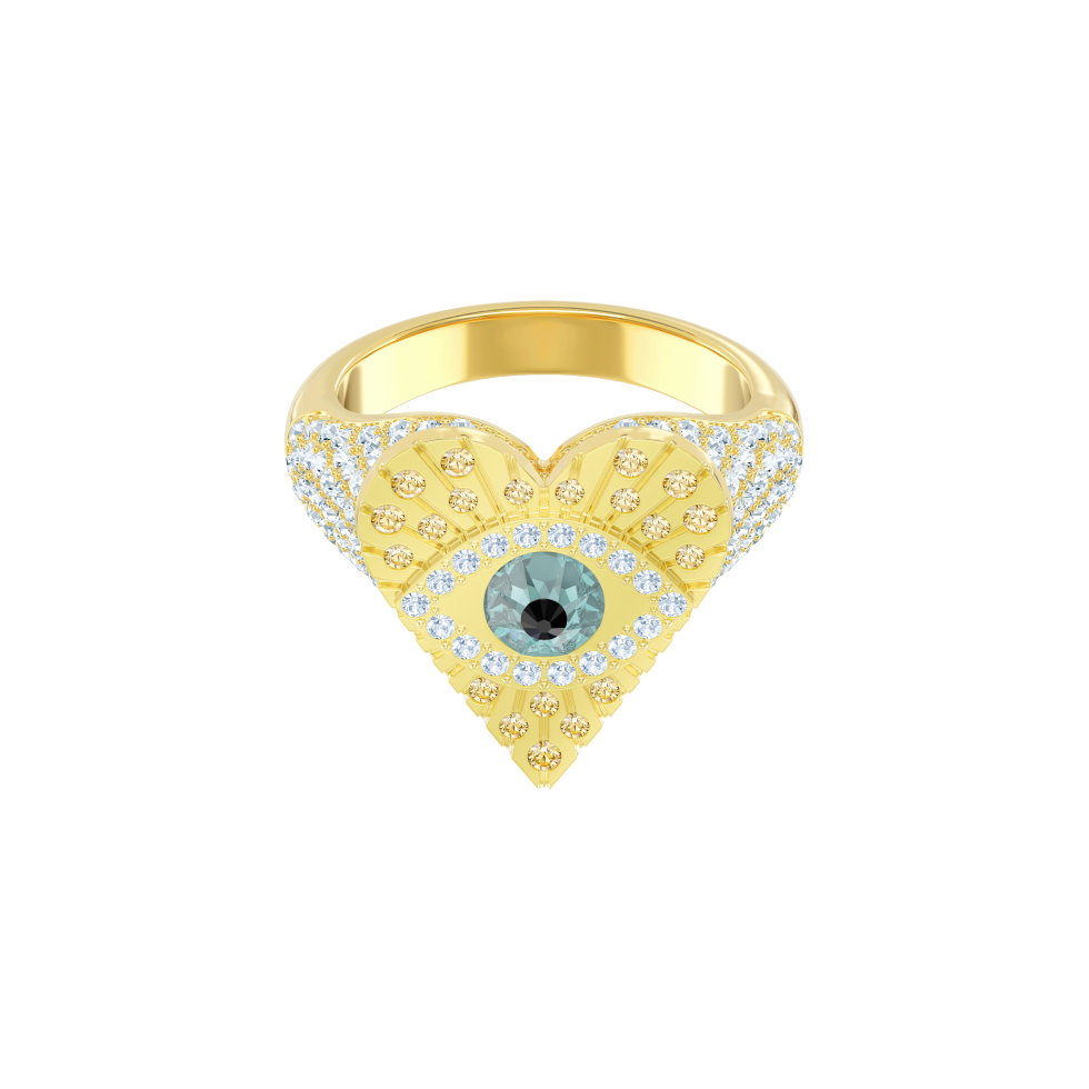 This fascinating ring cleverly combines three lucky talismans: a pair of wings, symbolizing hope and guidance, the protective evil eye motif, and a heart to represent love. Its striking design contrasts clear and colored crystal pavé with refined metalwork in opulent gold plating. A glam and meaningful gift idea. Matching items are available.