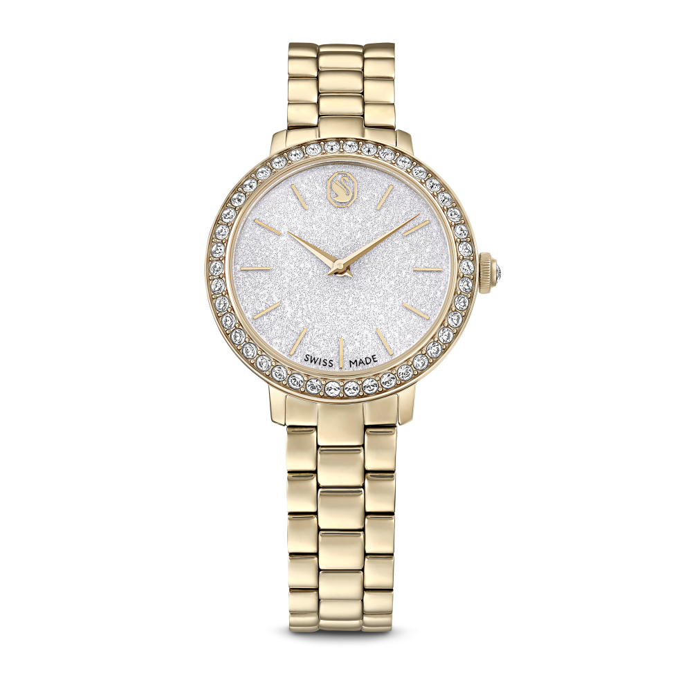 Inspired by Swarovski’s Matrix jewelry, this 30mm timepiece captures the same sense of contemporary and expressive styling. The stainless steel design is champagne gold-tone finished and features a pavé bezel set with 42 crystals. The beautifully round dial is given a glitter effect and includes slender hour markers and hands, as well as a swan logo at 12 o’clock. Along with an additional crystal set within the crown, this watch is notable for its three-link bracelet, which glides elegantly around the wrist. The Swiss Made timepiece is water resistant to 50m and is the perfect companion for any occasion.