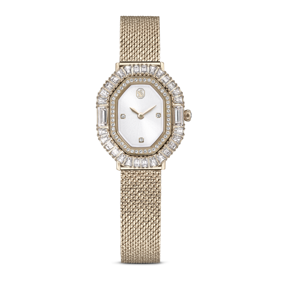 This innovative timepiece is a one-of-a-kind creation that combines signature design with mastery of light. Crafted with genuine savoir-faire, the watch is inspired by the Matrix jewelry family and features a 13 x 18 mm stainless steel case with a champagne gold-tone finish. The bezel is presented in the House’s signature octagon shape and is set with a stunning mix of 78 round and fancy cut crystals and Swarovski Zirconia. This provides a radiant frame for the minimalist sunray dial, which elegantly displays three crystal hour markers and a swan logo. A single crystal is also placed within the crown, while around the wrist, the luxury is heightened further by an adjustable mesh bracelet. This watch is water-resistant to 50m and symbolizes Swarovski’s modern luxury at its finest.