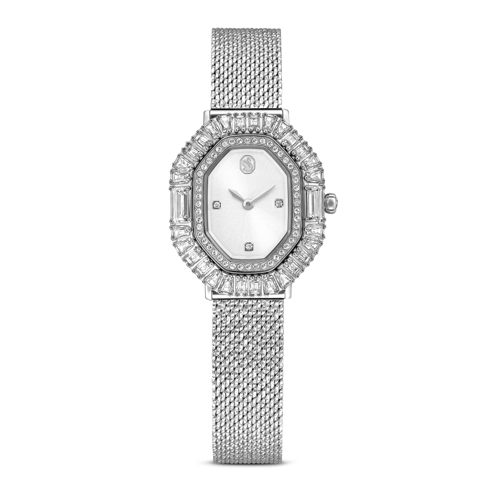 This innovative timepiece is a one-of-a-kind creation that combines signature design with mastery of light. Crafted with genuine savoir-faire, the watch is inspired by the Matrix jewelry family and features a 13 x 18 mm case in stainless steel. The bezel is presented in the House’s signature octagon shape and is set with a stunning mix of 78 round and fancy cut crystals and Swarovski Zirconia. This provides a radiant frame for the minimalist sunray dial, which elegantly displays three crystal hour markers and a swan logo. A single crystal is also placed within the crown, while around the wrist, the luxury is heightened further by an adjustable mesh bracelet. This watch is water-resistant to 50m and symbolizes Swarovski’s modern luxury at its very finest.