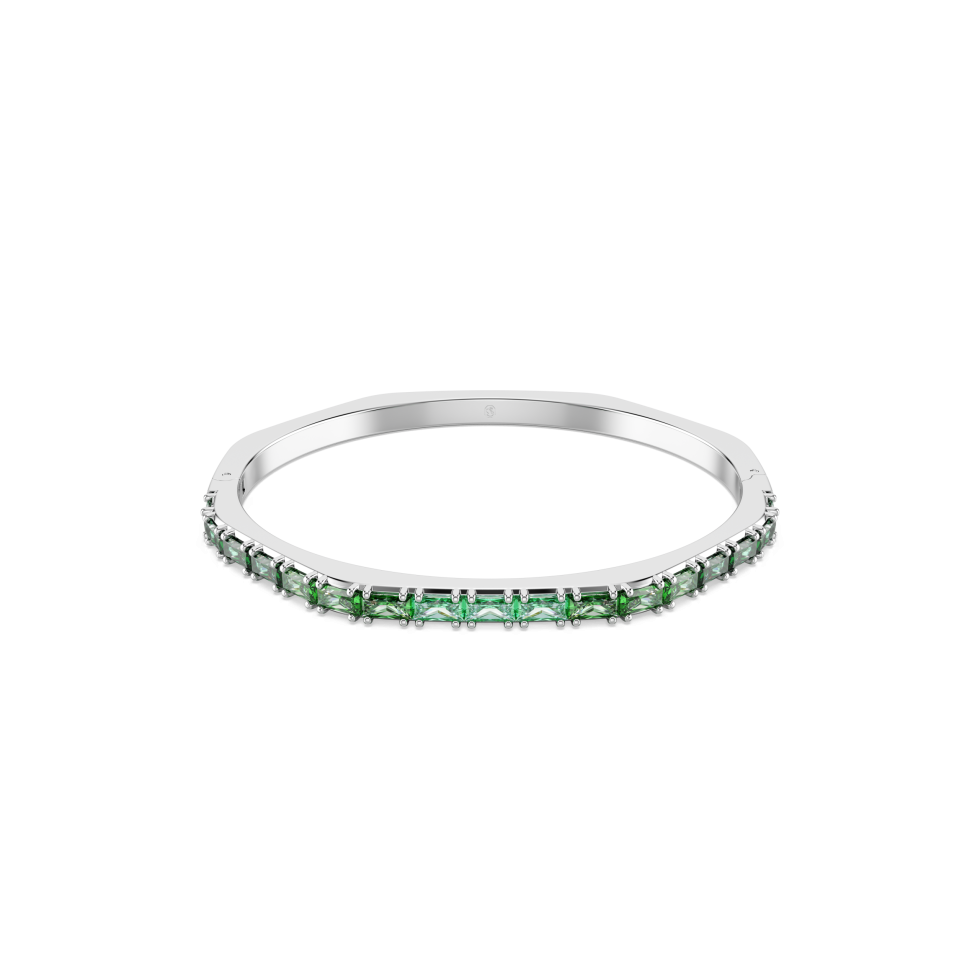 Ignite your everyday look with this hinged Matrix bangle. The rhodium plated design is crafted in Swarovski’s emblematic octagon shape and is playfully adorned with a gradient of green baguette-cut Swarovski Zirconia in a horizontal setting. Perfect for stacking alongside matching Matrix bangles, it’s a full surround of signature Swarovski color to express your most vibrant self.