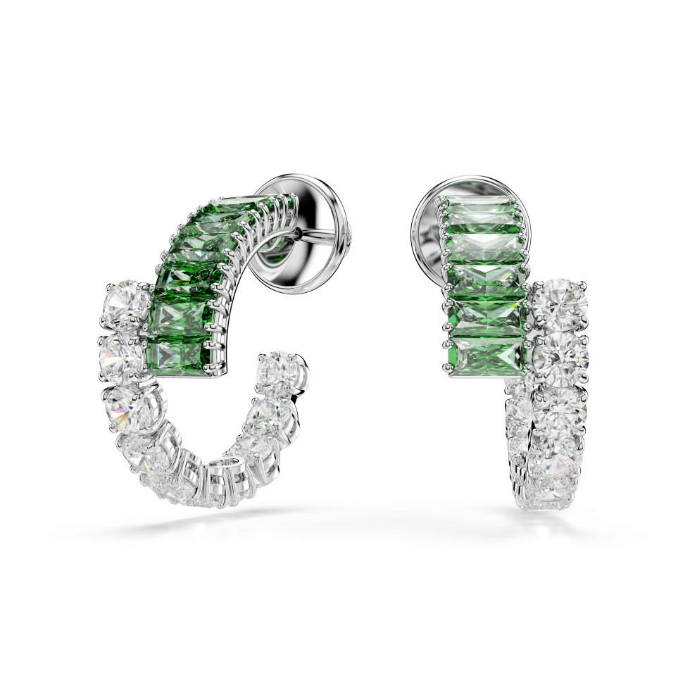 These luxurious Matrix earrings were crafted for a vivid glow. Each small hoop is rhodium plated and features an overlapping design set with clear and green Swarovski Zirconia in round and baguette cuts. A joyful choice for day-to-night styling, these earrings can be paired with a matching ring or bangle to accentuate the color in your style.