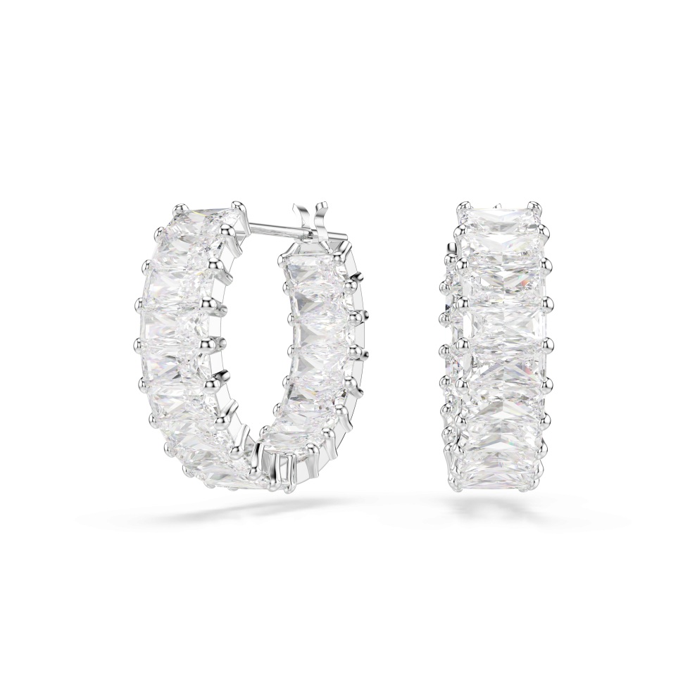 Reinvent your mini hoop style with this bright dose of Matrix light. Each rhodium plated earring is set with baguette-cut Swarovski Zirconia in prong settings, adding a halo of radiance to any outfit. Pair them with an all-around Matrix necklace for an all-over glow.