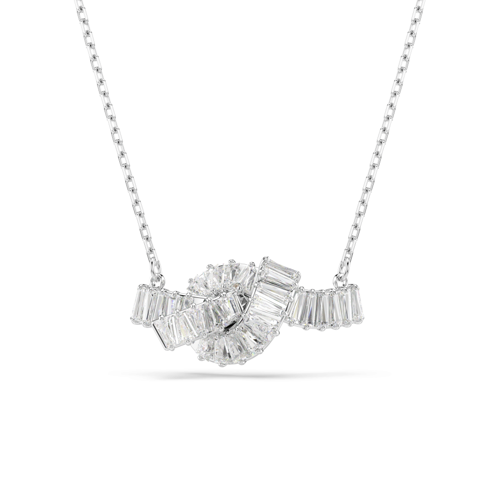 This elegant Swarovski pendant is tied in a knot to signify eternal connection. Suspended from a delicate chain, the ribbon-inspired motif is rhodium plated and features a sophisticated adornment of baguette-cut Swarovski Zirconia, each placed in a prong setting. It’s a sophisticated piece of everyday jewelry that matches beautifully with other Matrix creations.