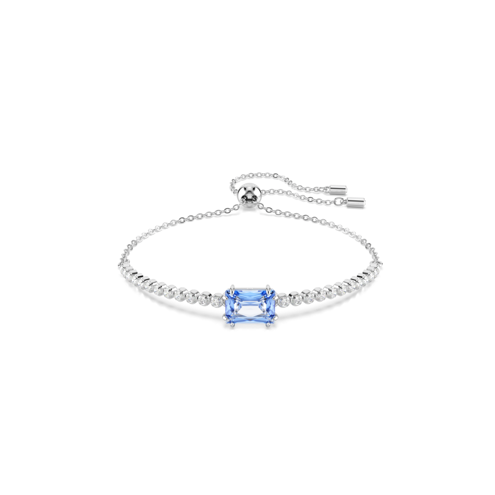 Adding a touch of radiance to any look, this classic tennis bracelet combines clear Swarovski Zirconia with a pop of color. Fastened with a sliding closure, the rhodium plated jewelry features a uniform row of clear Swarovski Zirconia and is accented with a baguette-cut blue Swarovski Zirconia at its center. A vibrant twist on a timeless style.