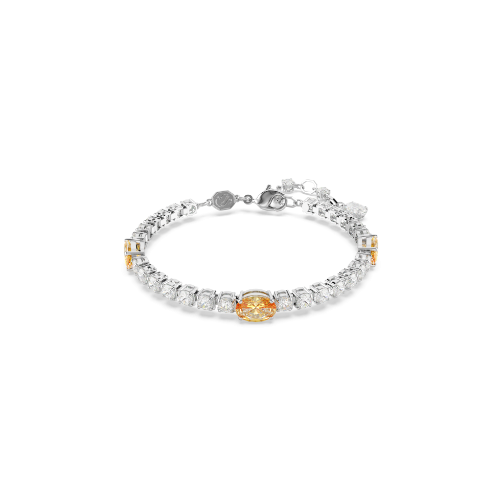 With a touch of Swarovski finesse, this Matrix Tennis bracelet has enhanced a classic style with glowing cuts and color. The rhodium-plated piece is fastened with a lobster closure and features an all-round display of prong-set round clear crystals, along with accents of yellow oval crystals that are bright and energizing. Wear it throughout the day for a radiant dose of joy.