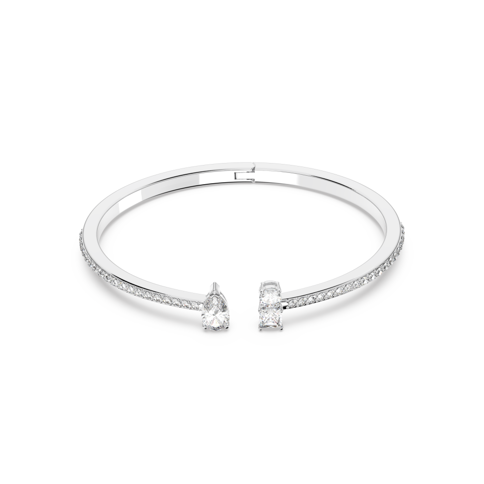 A timeless look for you: This cuff by Swarovski is a striking example of timeless design. It is covered with glittering pavé creating a vivid display of sparkles. The cuff is finished with one larger, drop-shaped stone, opposite a pair of round and square stones. A classic look, perfect for embellishing everyday outfits.