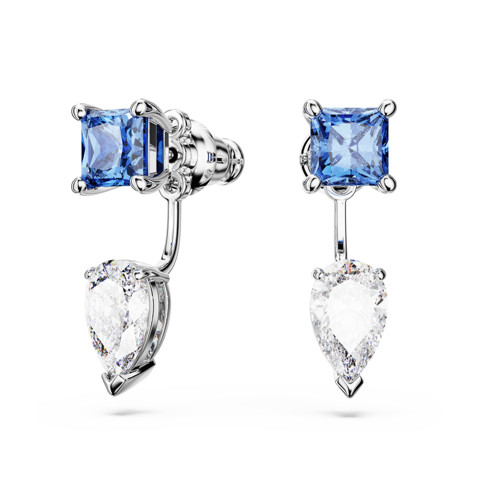 These attractive Mesmera earrings are a versatile and spellbinding choice. The pierced design is rhodium plated and features a pair of prong-set Swarovski Zirconia in pear and square cuts. Wear them as single blue studs or adjust the height of the detachable pear-cut drop to suit your style. A perfect gift to inject any evening outfit with elegance and color.