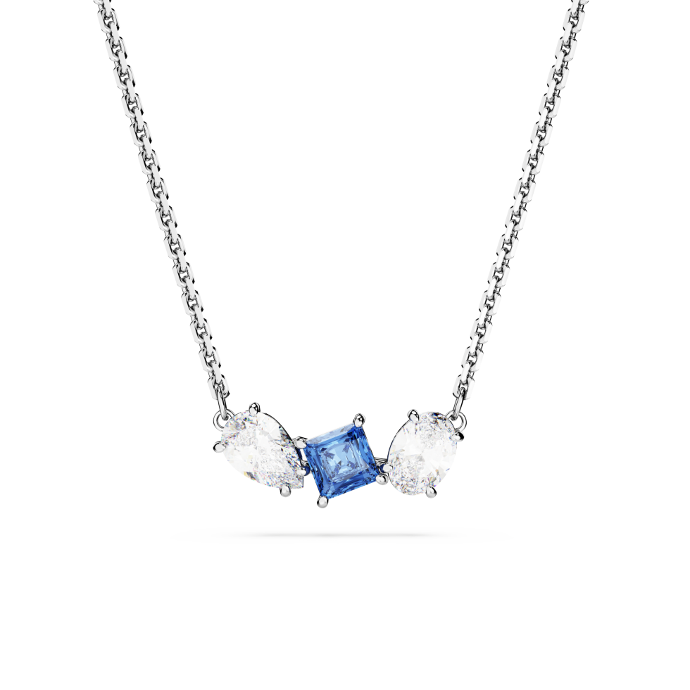 This elegant Mesmera pendant delivers exquisite refinement through its bold mix of cuts and color. Worn on a delicate chain, the rhodium plated design features a trio of prong-set Swarovski Zirconia in varying shapes with a radiant blue central stone. A wondrous gift that will accentuate any style.