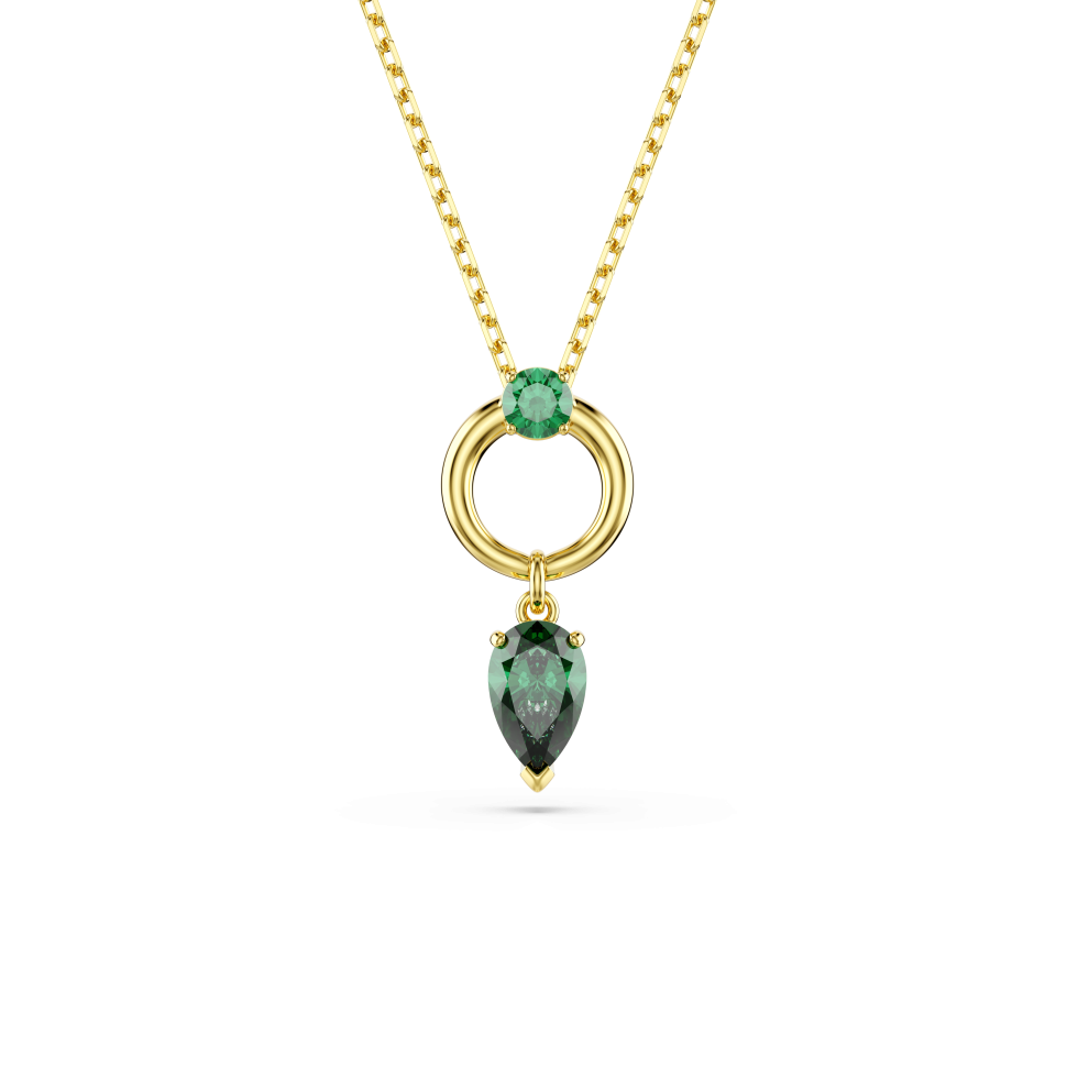 This Mesmera pendant blends color with refinement to create an eye-catching everyday piece of jewelry. The shimmering motif features a pear-cut Swarovski Zirconia in green, which is attached to a luxurious gold-tone plated hoop. An additional round-cut Swarovski Zirconia is placed at the center, while a sliding mechanism on the chain allows the pendant to be easily adjusted to your desired length.