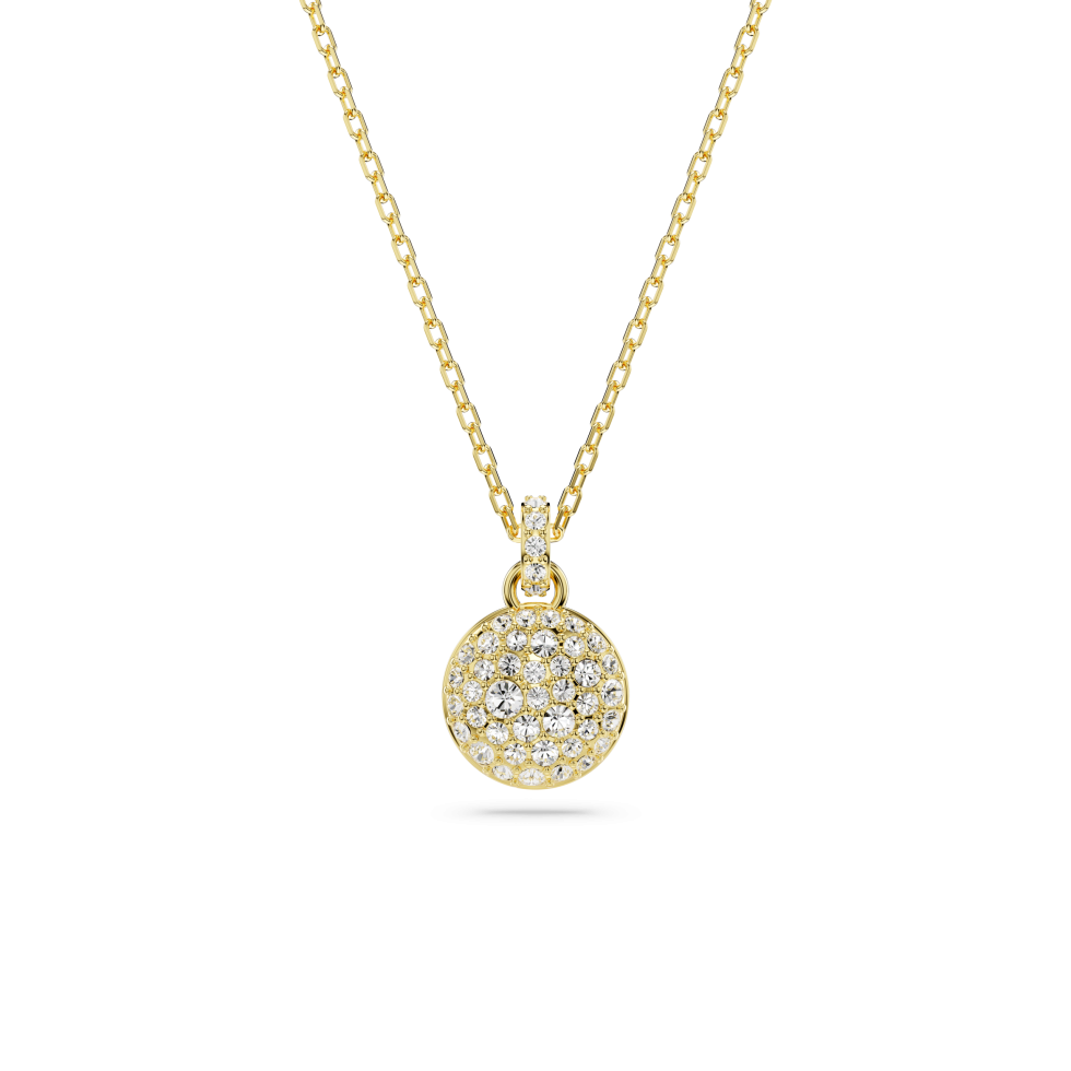 This galaxy-inspired pendant will bring dazzling impact to any style. The gold-tone plated design is worn on a delicate chain with a lobster closure and features a domed meteor motif that is beautifully adorned with a snow pavé of clear round crystals in different sizes. Wear it as a wondrous piece of light-catching joy.