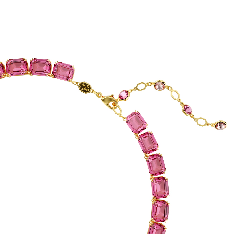 This striking Tennis necklace is perfectly crafted with uniform, octagon-cut pink crystals on a gold-tone plated prong setting. It is finished with a lobster closure and an elongation of round crystals in a vintage pink color. An elegant wardrobe essential, this piece can be worn on its own for an ultramodern daytime look or teamed with a Millenia bracelet for chic evening adornment.