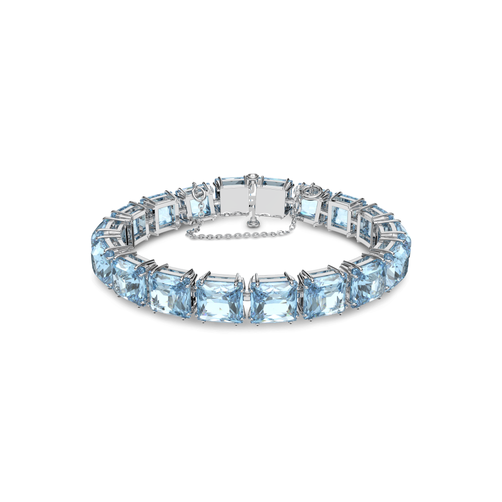 Add a shot of geometric color to any look with this striking, everyday Tennis bracelet. With a concealed fastening and sleek, rhodium-plated frame, it allows the vibrant, aquamarine, square-cut crystals to steal the spotlight. Wear yours solo over a cuff for a uniquely chic statement, day or night. This Tennis bracelet is part of the Millenia family, designed by Creative Director Giovanna Engelbert for Collection II. How to close and open it: slide the hooks into the corresponding holes at the base of the end stone and push to click into place. Fasten the security chain using the small lever clasp. To open, unfasten the security chain and press the buttons on either side of the stone at the same time to release the hooks.