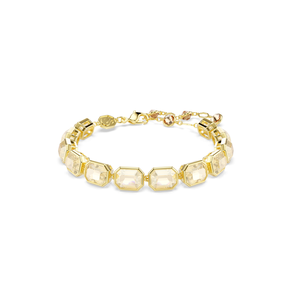 Be your brilliant best in this vivid Millenia bracelet. The gold-tone plated design features a strand of octagonal caramel crystals in a refined bezel setting. There is also a lobster closure with an elongation, allowing you to adjust the fit. Pair this bracelet with the matching necklace to elevate your everyday look.