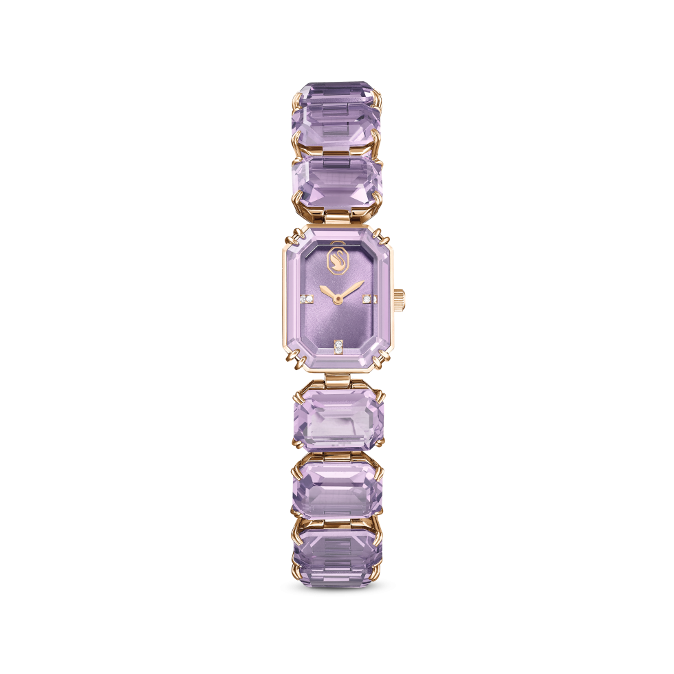 Inspired by the Millenia jewelry family, this candy-colored watch offers sensational wrist appeal. Crafted with a champagne gold-tone finish, the bracelet is expertly crafted with a row of octagon-cut crystals in a purple hue, connecting to an octagon-shape case with a sunray purple dial. Three clear crystals are used for hour markers, along with an additional crystal in the crown, while the Swan logo sits elegantly at 6 o’clock. This Swiss Made watch is water resistant to 50m and offers a playful choice for solo styling or layering.