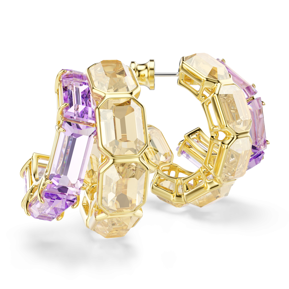 These multicolored earrings are the choice for all-out glamour. Each gold-tone plated piece features two asymmetrical mini hoops, with octagonal caramel crystals in a bezel setting, and purple crystals in a prong setting. A beautiful mix of contrasts that come together for one bold look. Wear these earrings alongside matching pieces from the same family to accentuate the effect.
