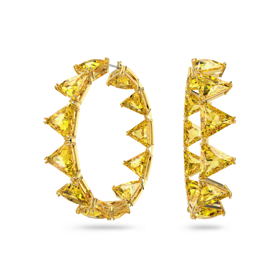 Make a bold statement with these eye-catching hoop earrings. Featuring dazzling triangle cut crystals in a mood-boosting yellow hue, this vibrant design is finished with a classic, gold-tone plated setting. Wear yours solo or styled with other pieces from the Matrix family for a playful take on everyday dressing. These earrings are part of the Matrix Family, designed for Collection III.
