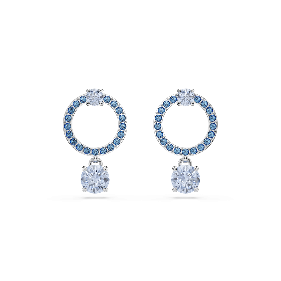These colorful pierced earrings are simple yet brilliant. Each piece features a round-cut blue crystal hanging from a small hoop, which itself is beautifully embellished with shimmering blue pavé. The dangling elements are designed to move whenever you turn your head, reflecting the light in every direction. A perfect way to make your style glow.
