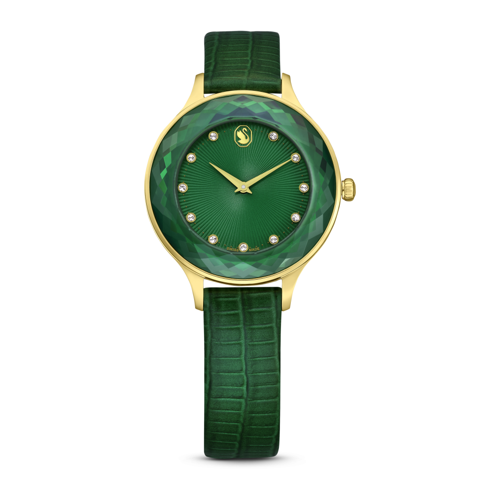 This mesmerizing 33 mm watch delivers a vibrant flash of color every time you put it on. The Swiss Made timepiece in stainless steel with a gold-tone finish is most notable for the bezel and face, which is crafted from a single piece of sapphire crystal with 72 facets. Adding extra depth, the green guilloche dial includes crystals for index markers and a graceful swan motif at 12 o’clock. This green watch is water-resistant to 50m and is presented on an Italian calf-skin leather strap embossed with a lizard pattern. Choose it to enliven your everyday style.